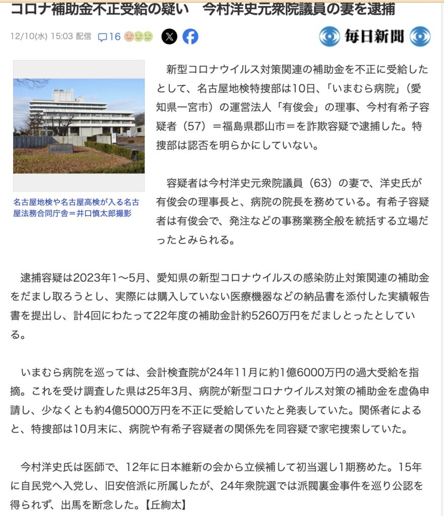 - 2023年度のコロナ対策補助金を虚偽申請した疑いで、妻の今村有希子氏が2025年12月に逮捕