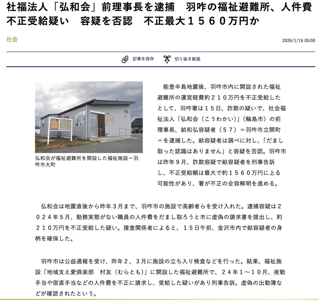 羽咋市は公益通報を受けて調査を行い、虚偽の出勤簿や夜勤・宿直手当の不正請求を確認し、昨年刑事告訴。不正受給額は最大約1560万円に上る可能性があり、警察が全容解明を進めている。弘和会は2013年設立で、羽咋市・輪島市で福祉施設を運営している。