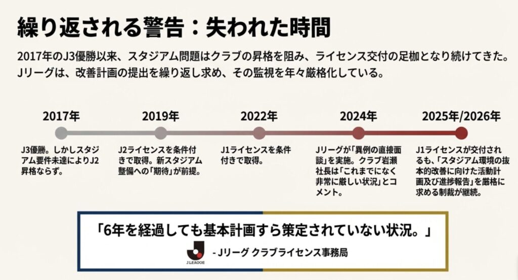 • 異例の直接面談と高まる危機感 事態の深刻さを物語るのが、2025年シーズンのライセンス申請時に実施された、Jリーグ参入以来初となるクラブライセンス交付第一審機関(FIB)からの直接面談である。これについて、クラブの岩瀬浩介社長は「これまでになく非常に厳しい状況」であったとコメントしており、クラブが崖っぷちに立たされていることを認めた。Jリーグ側は、特例措置を与えたにもかかわらず「6年を経過しても基本計画すら策定されていない」状況に極めて強い懸念を表明。これは約束が履行されなかったことへの明確な最後通牒であり、これ以上の猶予は認められないという厳しいメッセージであった。