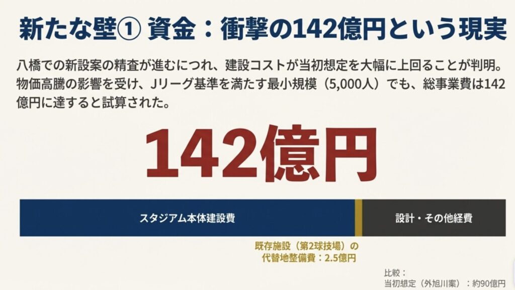 • 建設費の増大: 当初は約90億円程度と見込まれていましたが、2025年11月時点の最新試算では、最小の5,000人規模であっても約142億円、1万人規模になれば200億円近くに達する可能性が示されています。