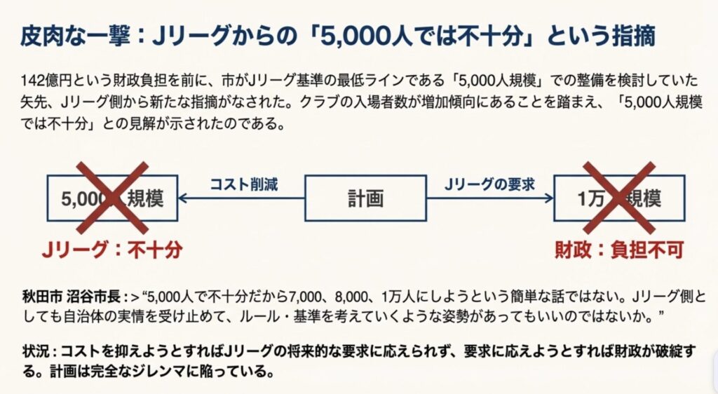 一方で、事業の主導を求められる秋田市の沼谷純市長は、深刻な財政的ジレンマに直面している。人口減少に伴う税収減が続く中、小中学校の校舎改築といった喫緊の課題も山積しており、スタジアム整備に巨額の費用を投じる余裕は極めて乏しい。最小5,000人規模の新設案ですら事業費が約142億円にまで膨れ上がっており、沼谷市長は「本市が単独で事業主体になることは極めて困難」であり、「3分の1ずつの負担であっても大きな財政負担」であると議会で明言。これは、県とクラブの協力なくしては計画が成り立たないという市の限界を示す悲痛な訴えである。