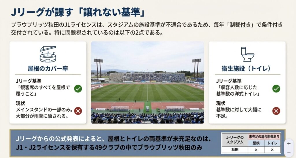 Jリーグが定めるクラブライセンス制度は、クラブの健全な経営と競技レベルの向上を目的とし、クラブの存続に不可欠な生命線である。しかし、その厳格な施設基準は、財政的に脆弱な地方クラブにとって極めて厳しい制約となっている。ブラウブリッツ秋田は、新スタジアム建設を前提とした特例措置によってライセンスを維持してきたが、具体的な進捗を示せないまま年月が経過したことで、クラブと地方行政のガバナンスに対するJリーグ側の信頼は失墜。協力関係は次第に敵対的な緊張感を帯び、クラブの存続そのものが危ぶまれる事態へと追い込まれていった。