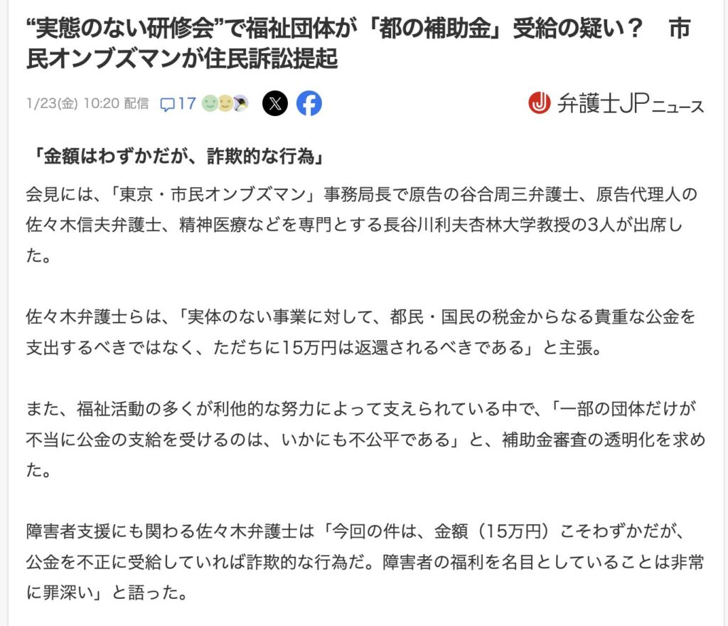 東京都内の障害者支援を行う任意の福祉団体が、実際には実施していないオンライン研修会を名目に東京都の補助金を不正受給した疑いがあるとして、「東京・市民オンブズマン」が補助金の返還を求める住民訴訟を提起した。2026年1月21日に東京地裁で第1回口頭弁論が行われた。